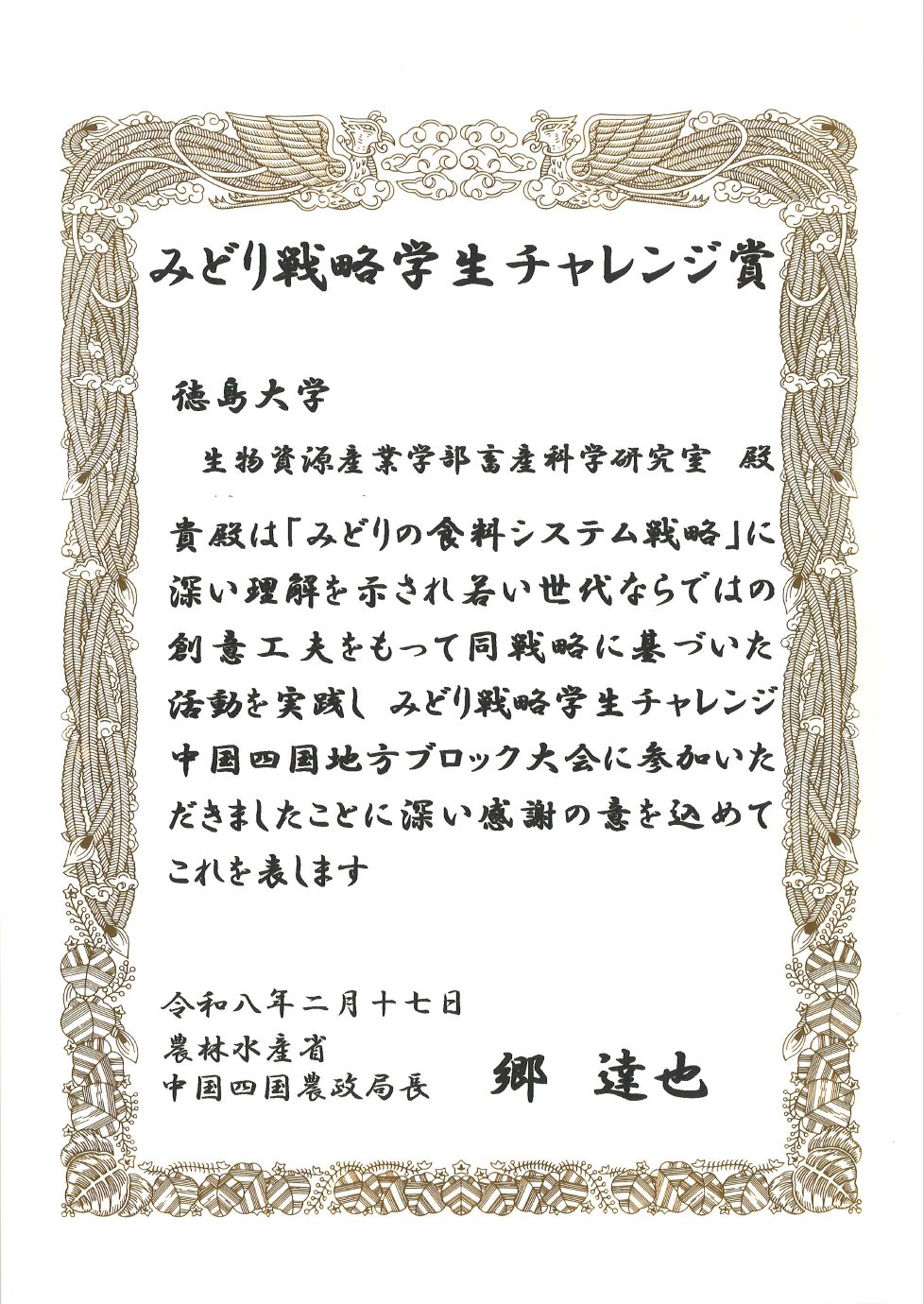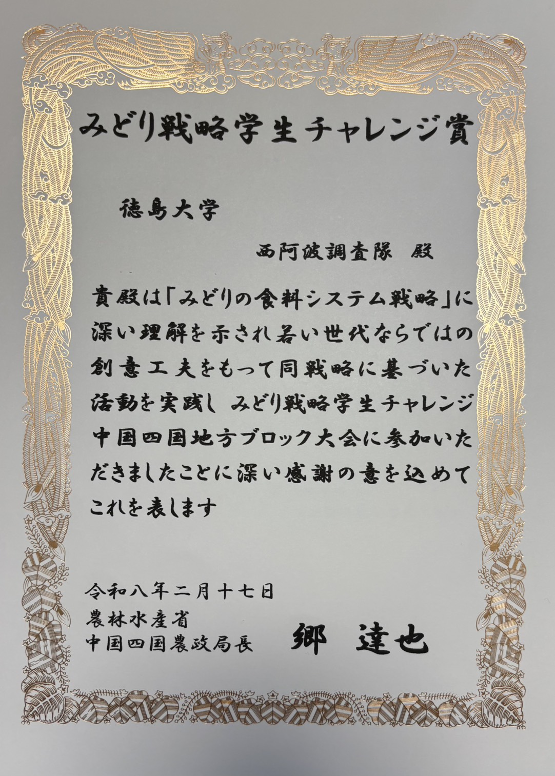 生物資源産業学部畜産科学研究室および西阿波調査隊が「みどり戦略学生チャレンジ賞」をいただきました。